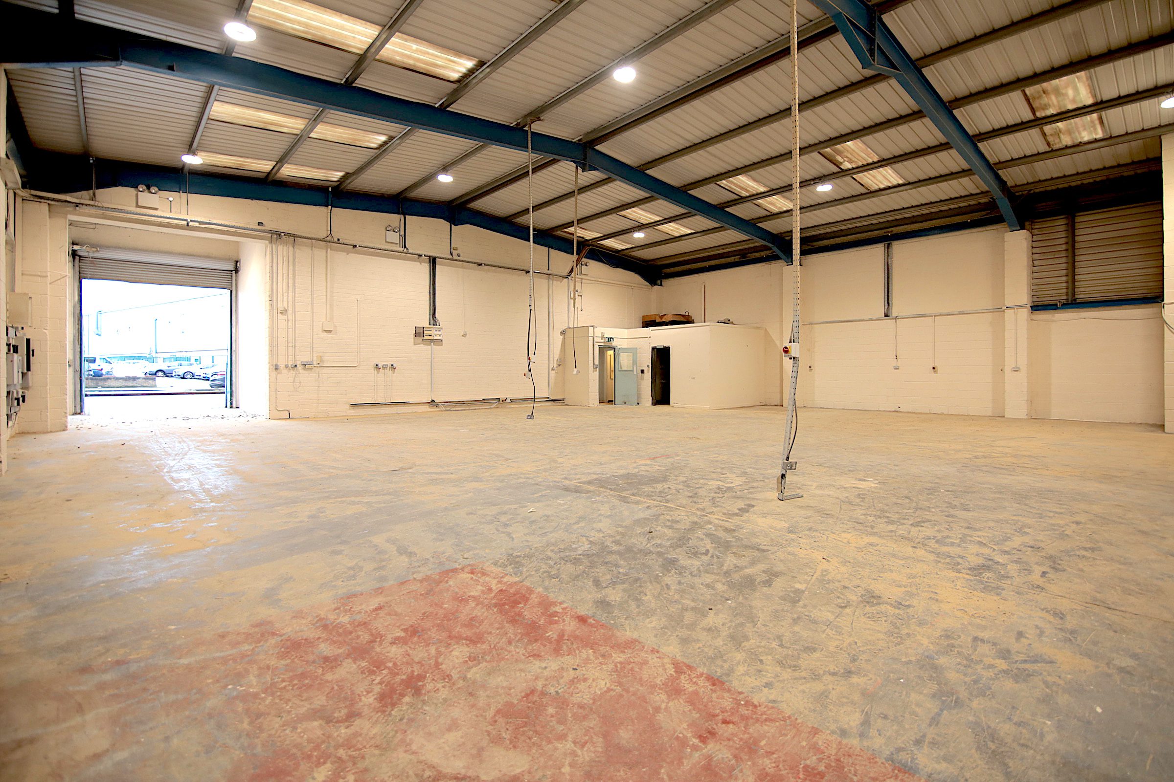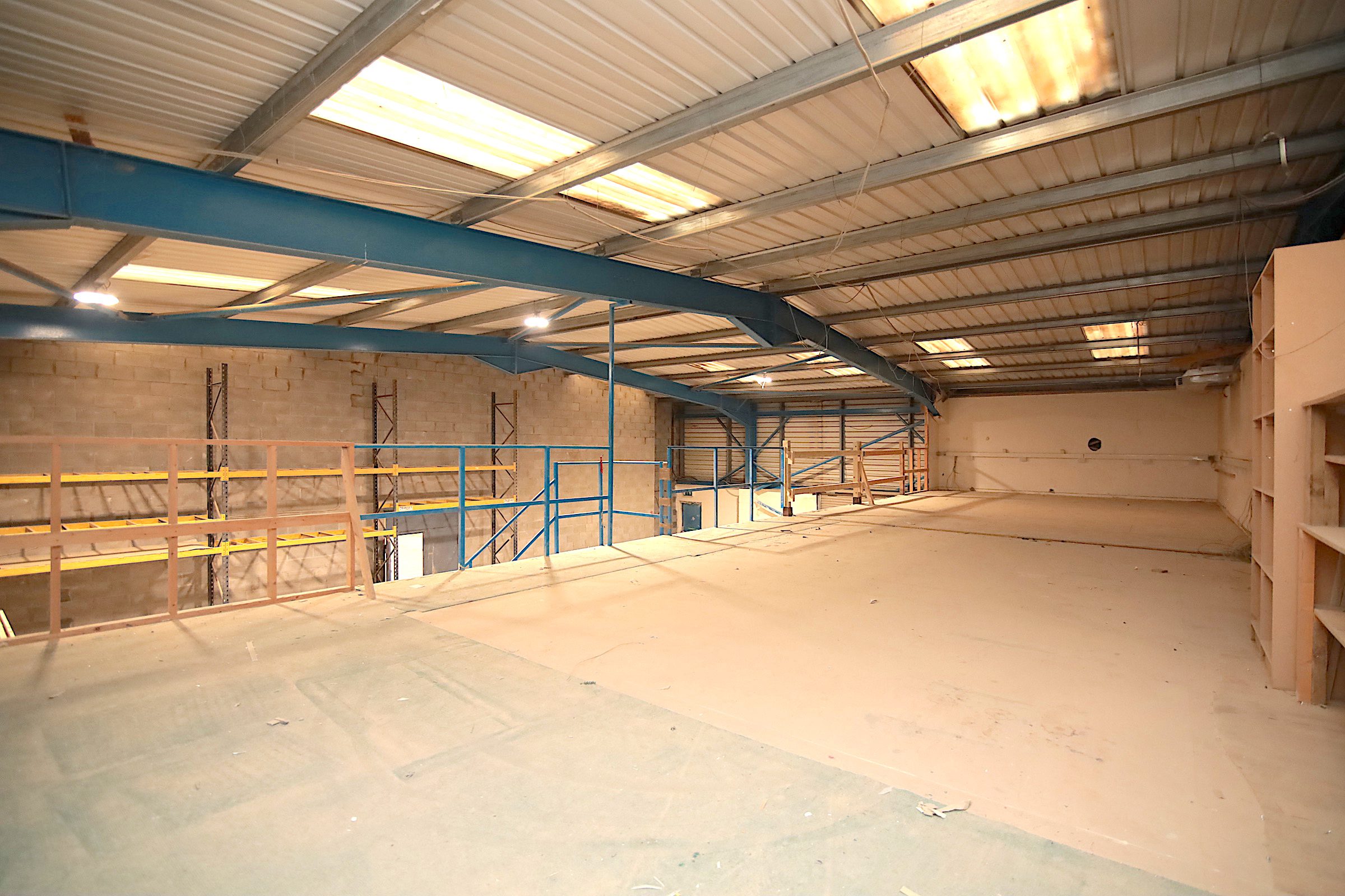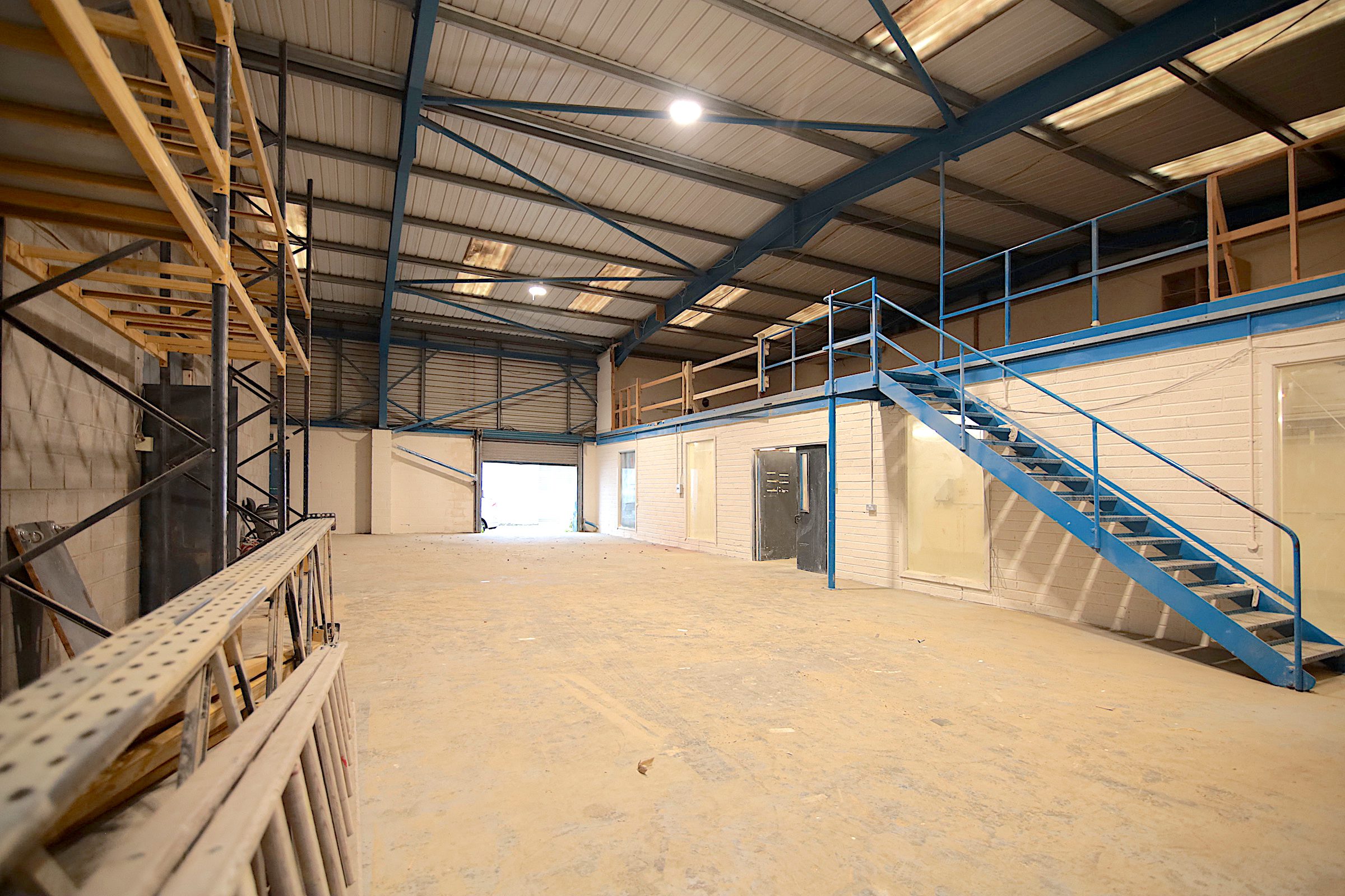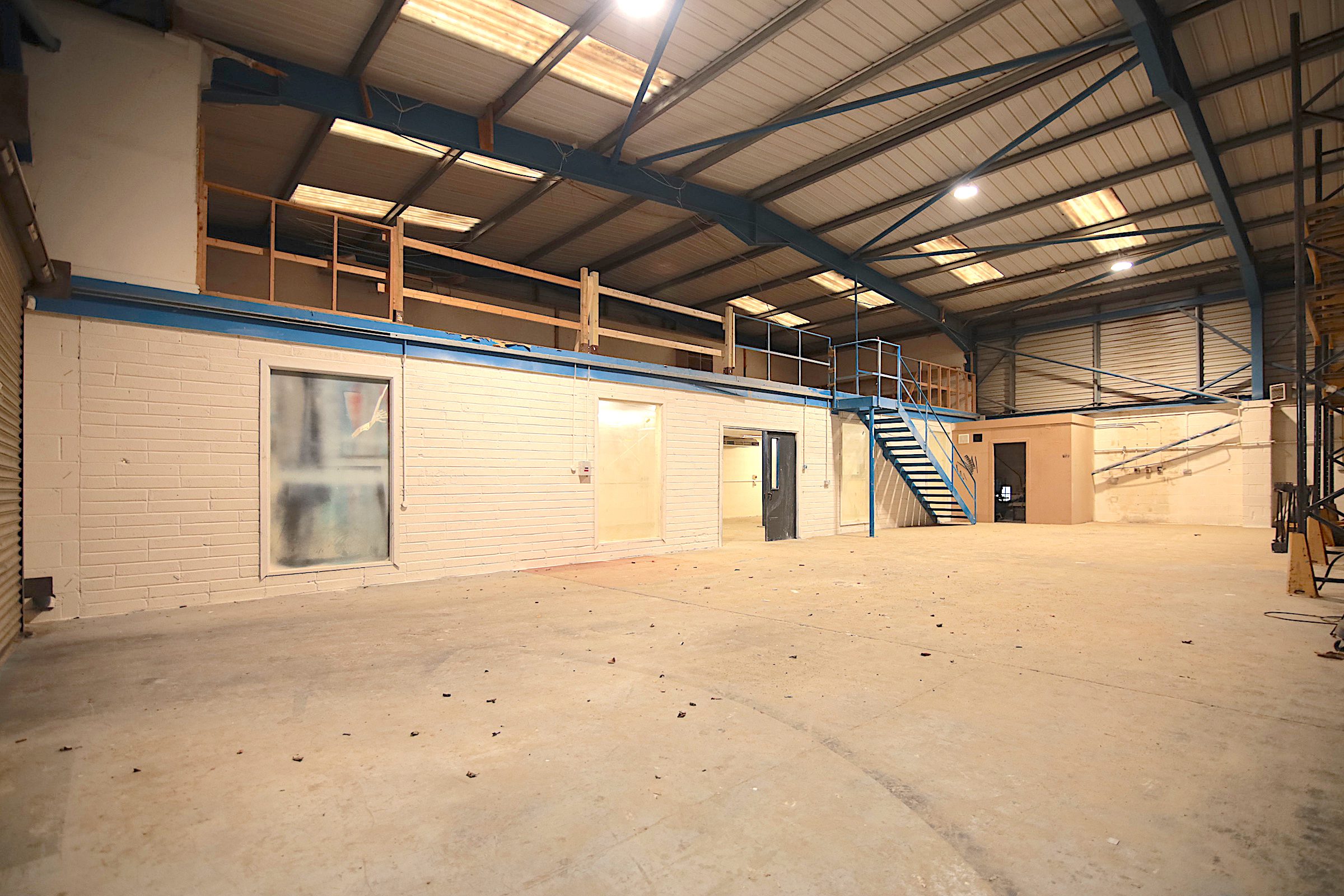 Large warehouse with loading bay and mezzanine floor to the rear.